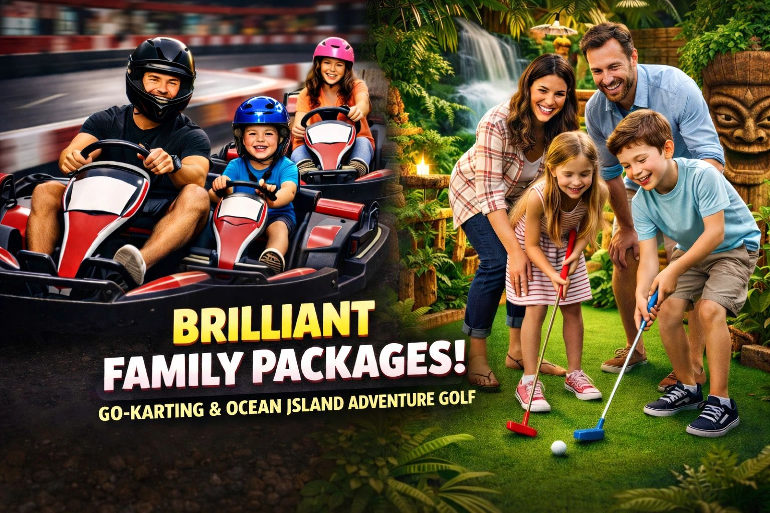 Children 8yrs-12yrs can drive with their family in petrol cadet karts. For 13yrs+ min inside leg 28", they can use the standard adult karts. After karting have a round of golf together in our new Ocean Island Adventure Golf.